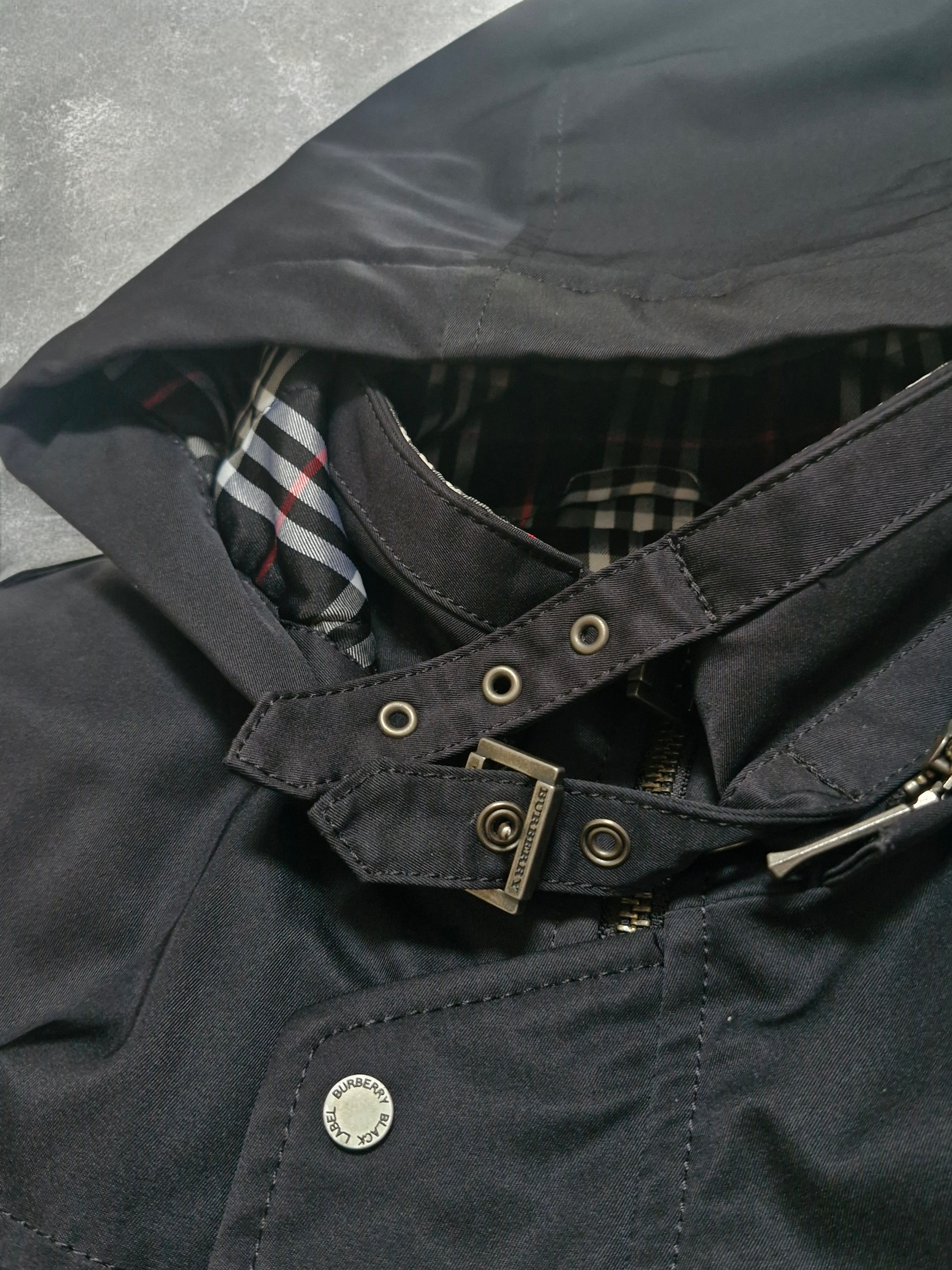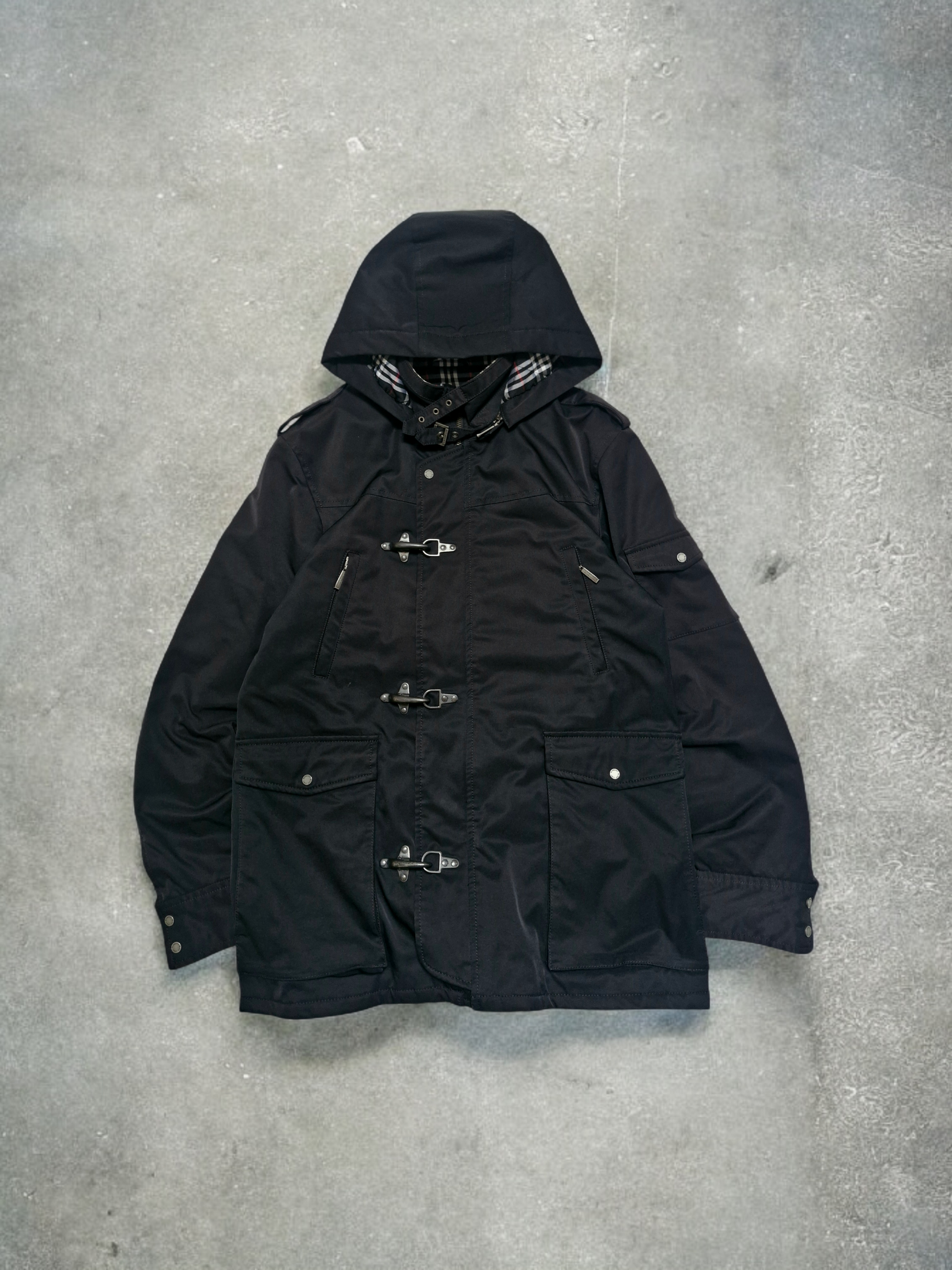 Premium Japanese-exclusive Burberry Black Label hooded jacket featuring signature metal fireman-style toggle closures and a durable midweight cotton-nylon shell. Finished with the iconic Burberry Black Label quilted check lining for added warmth and structure. Designed with a functional 4-pocket utility layout, adjustable button cuffs, and a structured removable hood for all-weather versatility. A high-quality piece from the sought-after Black Label era, blending classic Burberry detailing with a clean, technical outerwear silhouette.
